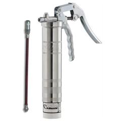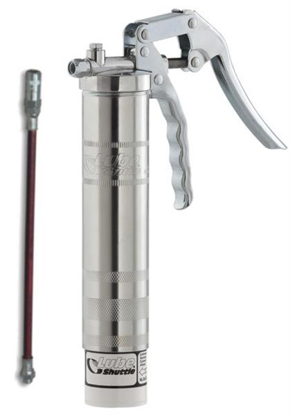 Einhandfettpresse für Lube-Shuttle®-System-Kartuschen mit verzinktem Stahl-Fettbehälter, ergonomisch geformtes Hebelwerk, verpackt in Einzelkarton