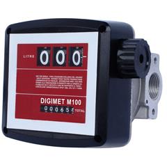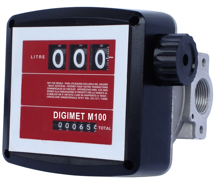 Mit volumetrisches Messprinzip, mechanisches Zählwerk, kalibrierbar, Durchflussmessbereich 10 - 100 l/min., max. Betriebsdruck 10 bar, Anschlüsse R1" innen, Genauigkeit ± 1%, rückstellbar 0 - 999 l, Totalanzeige 6-stellig.