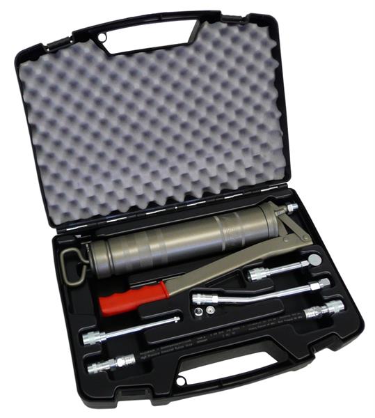 Fettpresse E500 mit Anschlussstück, Düsenrohr E4024 mit Überwurfmutter zum sicheren und einfachen Aufschrauben an die Fettpresse, inkl. Hochdruck-Gummipanzerschlauch RH-30-CC, Düsenrohr mit Schiebekupplung SK16, Düsenrohr für Kardanwellen F4020, jeweils mit