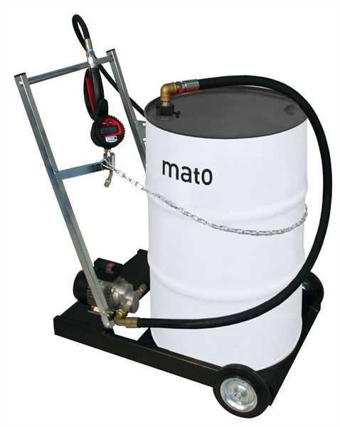 Elektro-Zahnradpumpe EP300, Stahlsaugrohr für 200 l Fass mit R2" Fassadapter inkl. Fussventil und Saugkorb, 4 m Druckschlauch DN20 mit DKR 3/4", stabilem Fahrwagen, schwarz lackiert mit 2 Festrollen und 2 Schwenkrolle mit Pistolenhalterung, DIGIMET E35 Handdurchlaufzähler mit Auslauf Motorenöl.