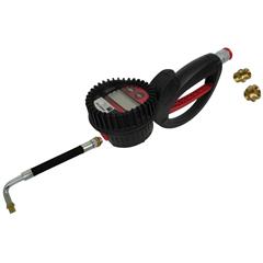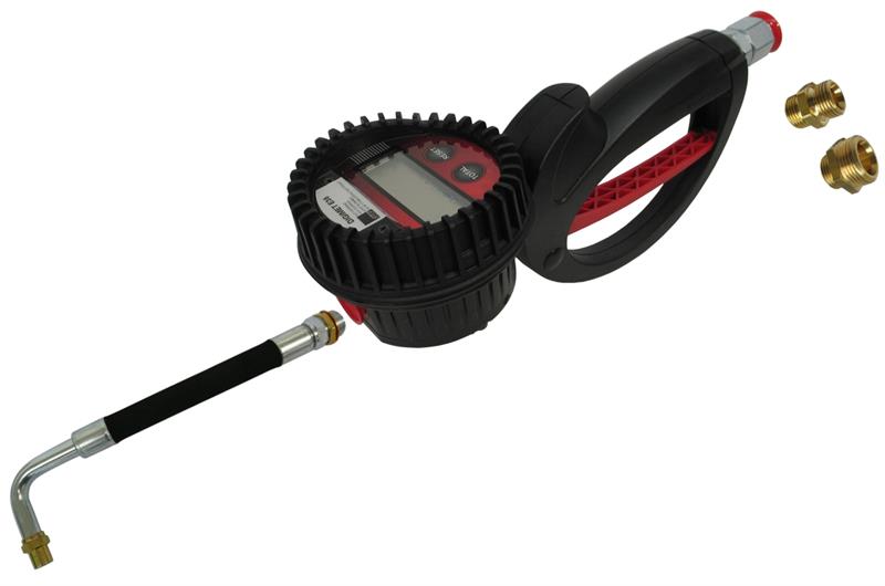 Mit LCD-Anzeige, Drehgelenk, mit Auslauf und Pistole, Messbereich bis 35 l/min., 2 Zählbereiche (total und rückstellbar), Messgenauigkeit ± 0,5 %, kalibrierbar, mit 2 Doppelnippel R½" und R¾" aussen, mit Gummi-Protektor, max. 100 bar, Display in Liter, Gallons, Quarts oder Pints