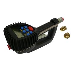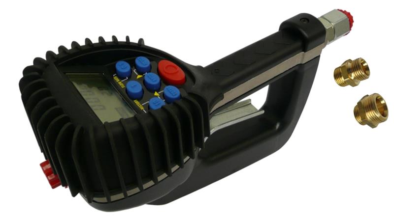 Fünf verschiedene Menge von 0,1 bis 99,9 Liter, eine Mengen von 1 - 99.9 Liter vorwählbar, die Pistole stellt nach der voreingestellten Menge ab, Messgenauigkeit ± 0,5%, Betriebsdruck max. 67 bar, mit Drehgelenk und Doppelnippel R1/2" und R3/4" aussen, elektronische LCD-Anzeige