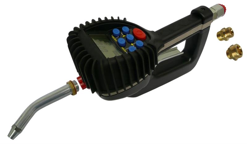 Fünf verschiedene Menge von 0,1 bis 99,9 Liter, eine Mengen von 1 - 99.9 Liter vorwählbar, die Pistole stellt nach der voreingestellten Menge ab, Messgenauigkeit ± 0,5%, Betriebsdruck max. 67 bar, mit Drehgelenk und Doppelnippel R1/2" und R3/4" aussen, elektronische LCD-Anzeige