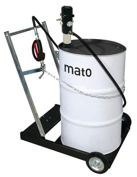 Pumpenaggregat, Alu Saugrohr 3/4" mit Fussventil, 4 m Druckschlauch DN12, mit Ölpistole Auslauf Motorenöl mit Tropfschutz, 4-Rad Fahrwagen mit Pistolenhalterung, schwarz lackiert, 2 Festrollen, 2 Schwenkrolle.