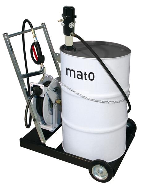Ölförderpumpensystem pneuMATO 3 mit Druckübersetzung 1:3, Schlauchaufroller offen mit 10 m Druckschlauch DN12, Alu-Saugrohr für 200 l Fass mit Fussventil, Ölfüllpistole Auslauf Motorenöl mit Tropfschutz, stabiler 4-Rad Fahrwagen mit Pistolenhalterung, schwarz lackiert, 2 Festrollen, 2 Schwenkrolle