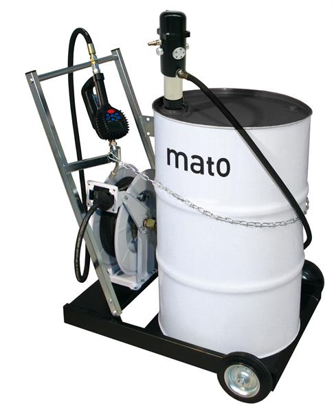 Ölförderpumpensystem pneuMATO 3 mit Druckübersetzung 1:3, Schlauchaufroller offen mit 10 m Druckschlauch DN12, Alu-Saugrohr für 200 l Fass mit Fussventil, stabiler 4-Rad Fahrwagen mit Pistolenhalterung, schwarz lackiert, 2 Festrollen, 2 Schwenkrolle