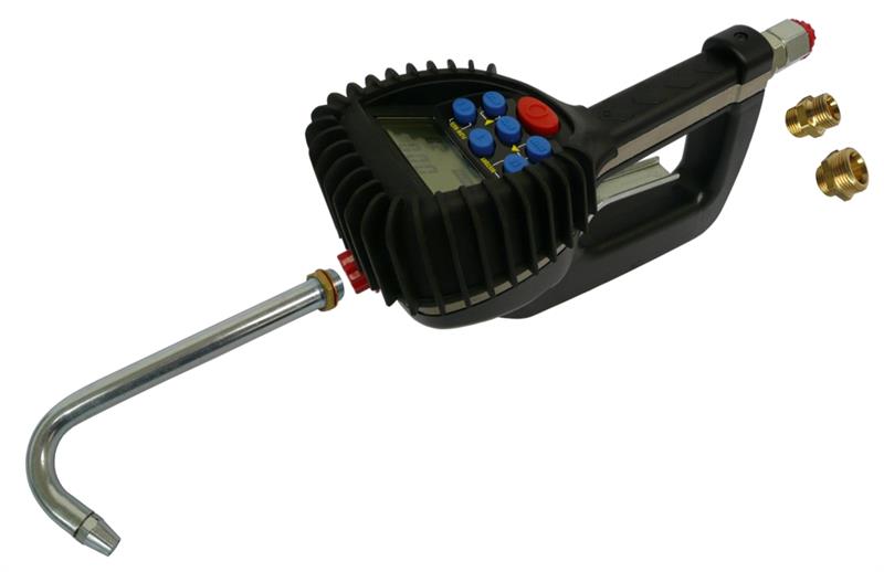 Fünf verschiedene Menge von 0,1 bis 99,9 Liter, eine Mengen von 1 - 99.9 Liter vorwählbar, die Pistole stellt nach der voreingestellten Menge ab, Messgenauigkeit ± 0,5%, Betriebsdruck max. 67 bar, mit Drehgelenk und Doppelnippel R1/2" und R3/4" aussen, elektronische LCD-Anzeige
