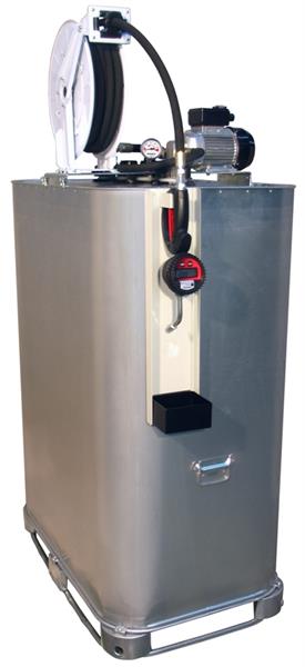 Elektro-Zahnradpumpe EP400, Stahlsaugrohr für 1000 l - Tank mit 2" Fassadapter inkl. Fussventil und Saugkorb, Schlauchaufroller offen mit 8 m Druckschlauch DN16, doppelwandiger 1000 l Vorrats- und Entsorgungstank, inkl. Füllstandsanzeiger, Tropfschale mit Halterung und Montagebrücke