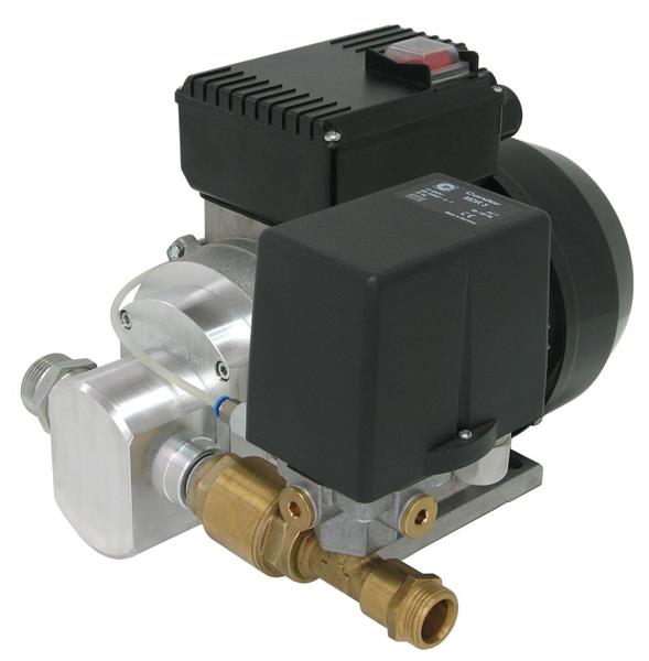 Selbstansaugende Zahnradpumpe mit 3 m Netzanschlusskabel, integrierter Bypass-Überdruckregelung, geschütztem Ein-/Ausschalter, für den Einsatz bei grossen Rohrleitungswiderständen und/oder hochviskosen Motoren, Getriebe und Hydraulikölen geeignet, Medien nach Gefahrenklasse A3, Flammpunkt höher als 55ºC.