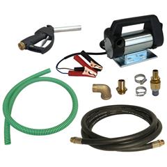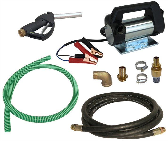 Selbstansaugende Flügelzellenpumpe, mit Batterieanschluss zum Nachtanken auf der Baustelle und in der Landwirtschaft. Geeignet für Diesel und Heizöl EL (andere Medien auf Anfrage), Förderdruck ca. 1 bar, mit 3,5 m Abgabeschlauch DN20 3/4" und 1,5 m PVC-Gewebe-Saugschlauch 3/4" x 19