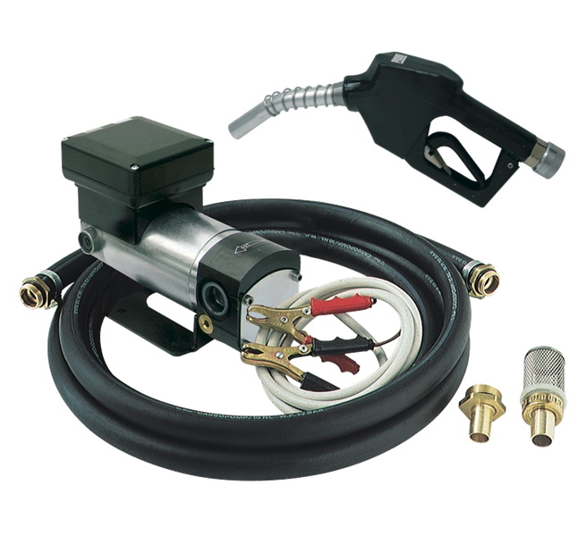 Tragbares Pumpenaggregat zum Umfüllen von Dieselkraftstoff, bestehend aus der Elektropumpe mit 12- bzw. 24-Volt-Gleichstrommotor.