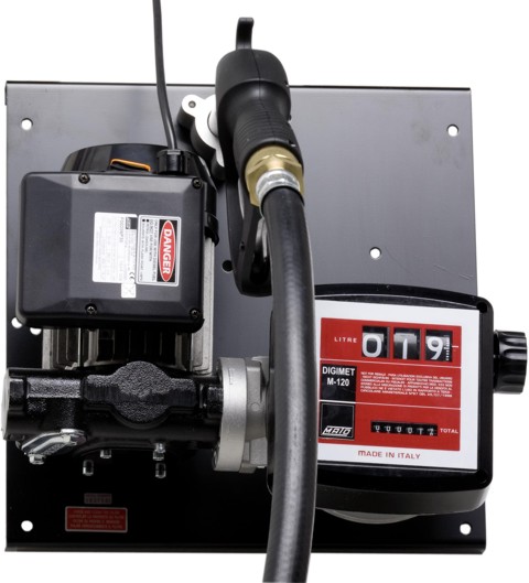 Auf Platte montierte Flügelzellenpumpe Panther 56 mit Pistolenhalterung, mit 4 m Abgabeschlauch DN20 und Durchflussmengenzähler K33, ohne Ansaugschlauch, geeignet für Diesel, Heizöl, Biodiesel (RME)