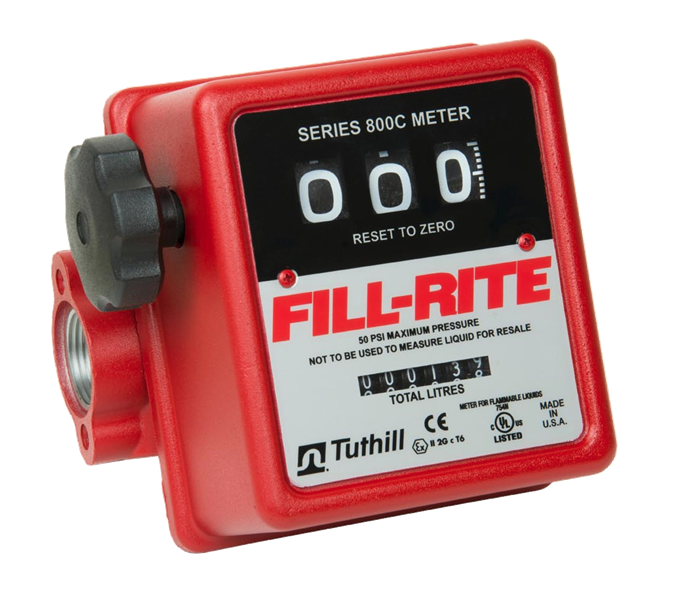 Diesel / Benzin / Kerosin Zähler mit robustes mechanisches Zählwerk im Metallgehäuse, 3- stellige rückstellbare Anzeige, 6-stelliger Summenzähler, Anschlüsse 1” IG, Durchfluss 20 - 75 l/min., Durchflussrichtung horizontal links nach rechts, Betriebsdruck max. 3.5 bar, Temperaturbereich -20°C bis + 60°C, Genauigkeit ± 1%.