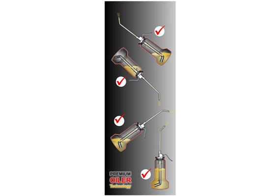 Avec tube d'aspiration rotatif, lubrificateur de haute qualité pour une utilisation professionnelle dans tous les domaines de la maintenance et du service, réservoir en inox, double mécanisme de pompage en laiton de haute qualité avec tube d'aspiration coudé et rotatif. Huilage possible dans chaque palier