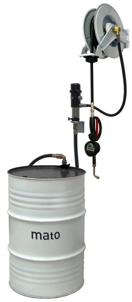 Pompe à huile pneumatique pour fûts de 200 l, avec tube d‘aspiration avec évent, flexible 2 m DN20, version étalonnable avec clapet de sécurité anti-air, fl exible de liaison 1 m DN12 vers l‘enrouleur, enrouleur ouvert avec 10 m fl exible DN12