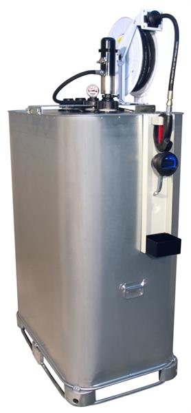 Pompe pneuMATO 1, rapport de pression 1:1, enrouleur de tuyau ouvert avec 10 m de tuyau de refoulement DN12, tube d'aspiration en acier avec clapet de pied et crépine, réservoir de stockage à double paroi de 1000 l avec indicateur de niveau, bac d'égouttage avec support, pont de montage, compteur manuel DIGIMET E35-AF pour antigel
