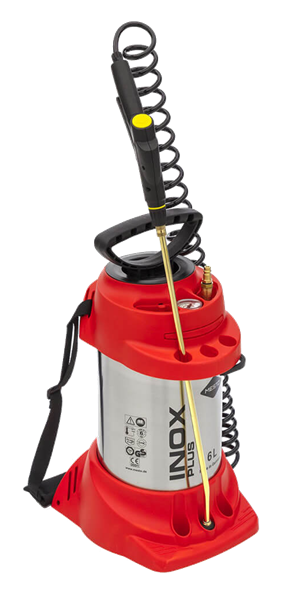 Récipient en acier inoxydable, 6 bar ,mobile avec joints en FPM (Viton), buse en laiton cône creux 1,1 mm, lance de pulvérisation en laiton 50 cm, tournant 360°, flexible spiralé 2,5 m, voyants de niveau avec soupape de remplissage intégrée