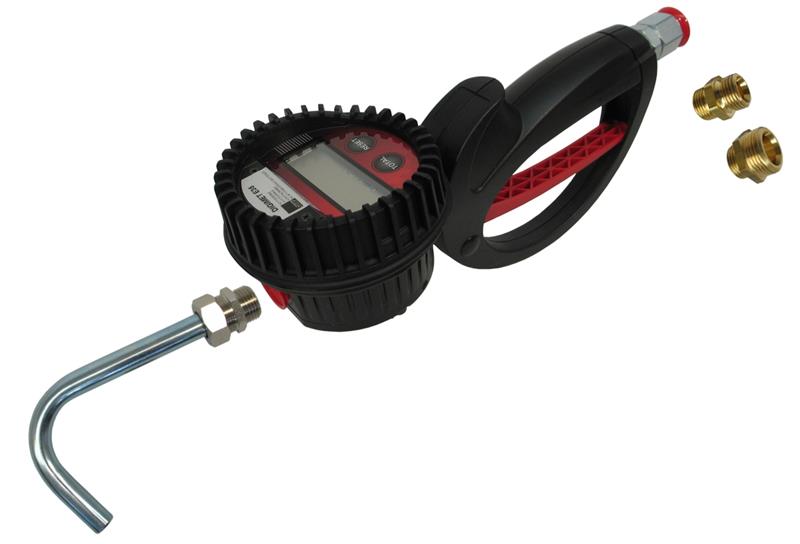 Con display LCD, snodo girevole, con beccuccio e pistola, campo di misura fino a 35 l/min, 2 contatori (totale e azzerabile), precisione di misura ± 0,5 %, calibrabile, con 2 doppi raccordi maschio R½" e R¾", con protezione in gomma, pressione max. 100 bar, display in litri, galloni, quarti o pinte.