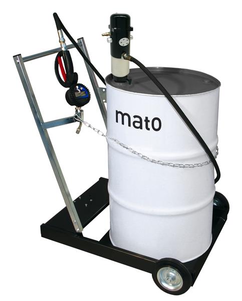 Pompa pneuMATO 1, rapporto di pressione 1:1, tubo di mandata da 4 m DN12, tubo di aspirazione in acciaio per fusti da 200 l con valvola a pedale e cestello di aspirazione, carrello robusto con supporto per pistola, verniciato nero, 2 ruote fisse, 2 ruote piroettanti, contatore manuale DIGIMET E35-AF per antigelo