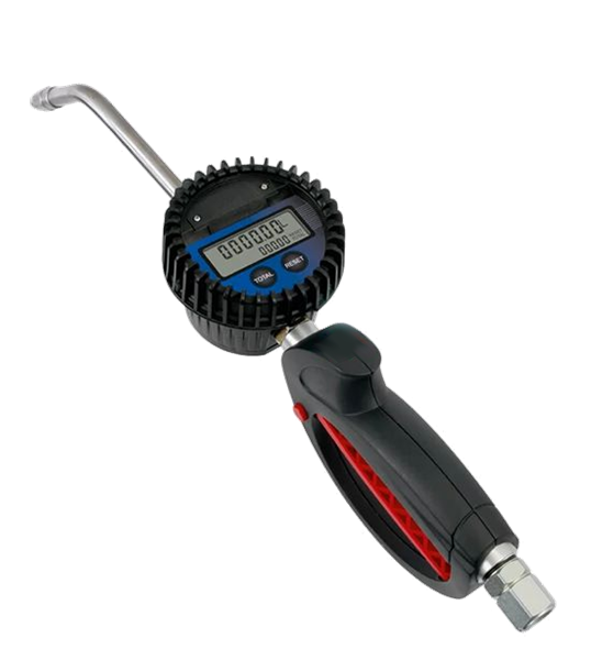 Per antigelo e sostanze acquose, con indicatore LCD, giunto girevole in acciaio inossidabile, con uscita in acciaio inossidabile e pistola verniciato, campo di misura fino a 35 l/min., 2 misure (totale e azzerabile), precisione ± 0,5%, calibrato, con 2 raccordi doppi R1/2" e R3/4"- esterno, con protettore in gomma, pressione mas. 100 bar. Display in litri, galloni, quarts o pints